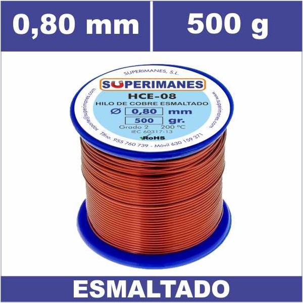 Alambres de cobre esmaltados en 0.80 mm carrete 500 gramos. Clase 200º Grado 2. Rollos de hilos de cobre de gran calidad. También disponibles en otros carretes. Consultar estos cables de cobre para otros pesos.