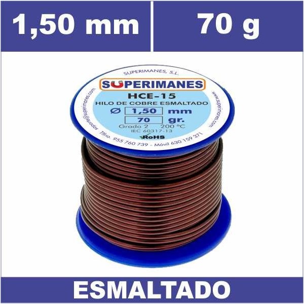 Alambres de cobre esmaltados en 1.50 mm carrete 70 gramos. Clase 200º Grado 2. Rollos de hilos de cobre de gran calidad. También disponibles en otros carretes. Consultar estos cables de cobre para otros pesos.