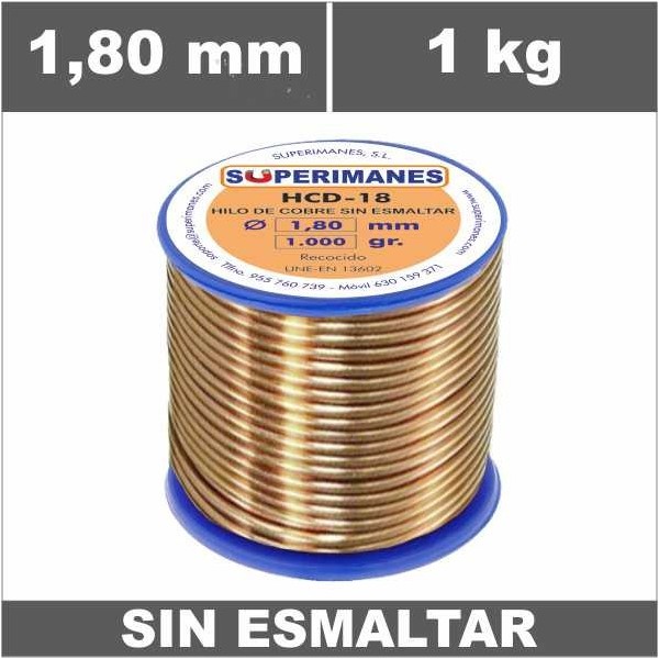Alambres de cobre sin esmaltar en espesor 1.80 mm carrete de 1 kilogramo de peso. Consultar estos cables de cobre para otros pesos. Rollos de hilos de cobre desnudo de gran calidad.