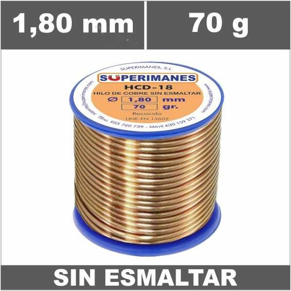 Alambres de cobre sin esmaltar en espesor 1.80 mm carrete de 70 gramos de peso. Consultar estos cables de cobre para otros pesos. Rollos de hilos de cobre desnudo de gran calidad.