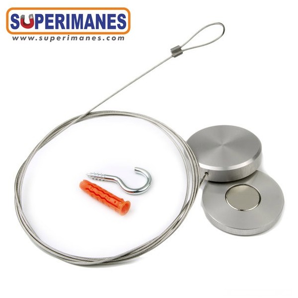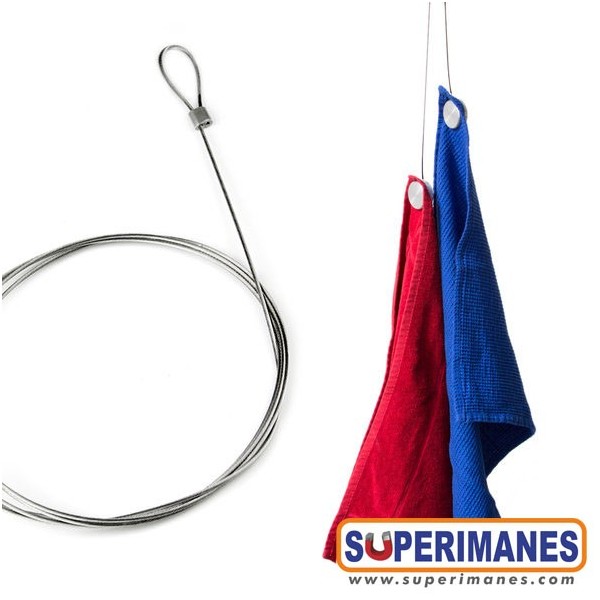 El cable de acero inoxidable con hembrilla mide 120 cm. En el interior de los discos de aluminio anodizado hay dos potentes imanes de neodimio y las toallas se sujetan con firmeza en cualquier situación. El paquete incluye también un gancho con taco.
