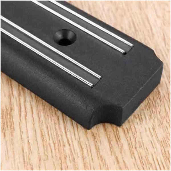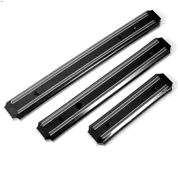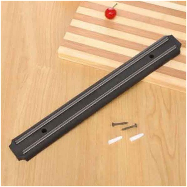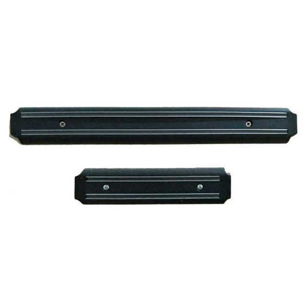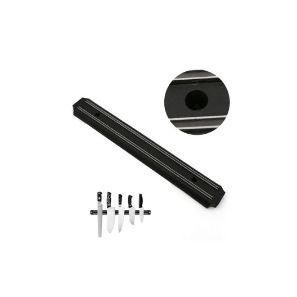 Soporte magnético para cuchillos o herramientas. Largo de 55.5 cms. Fabricado en plástico color negro. Con dos orificios para atornillar en la pared con tornillos de cabeza avellanada. Base para colocar en la cocina y colgar los cuchillos de una forma limpia y original.