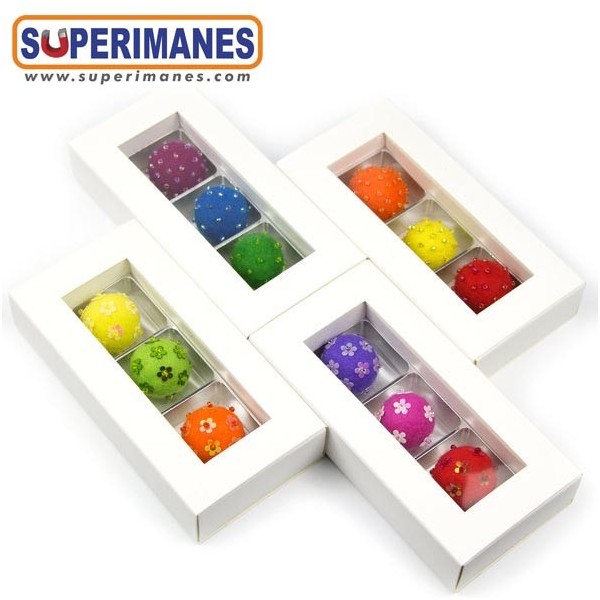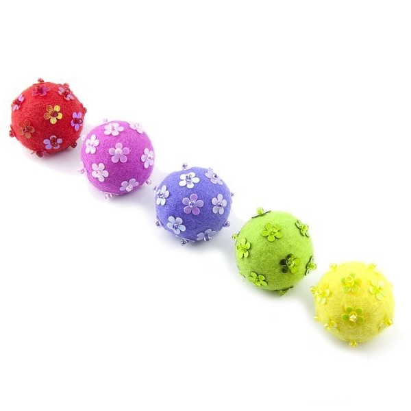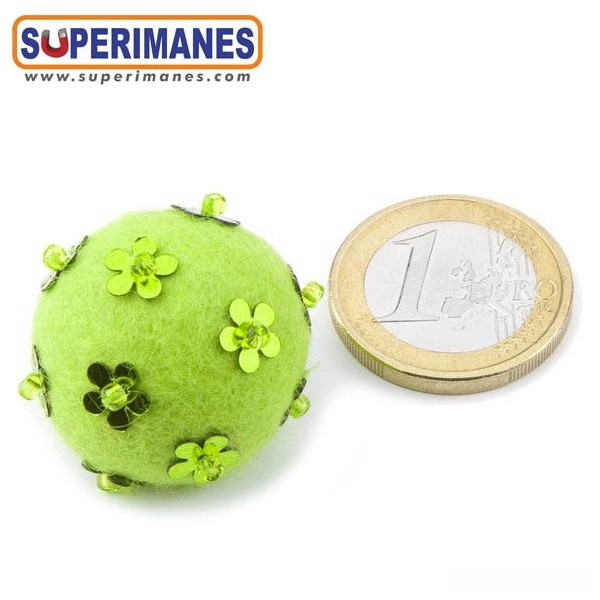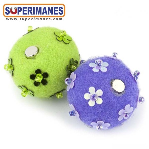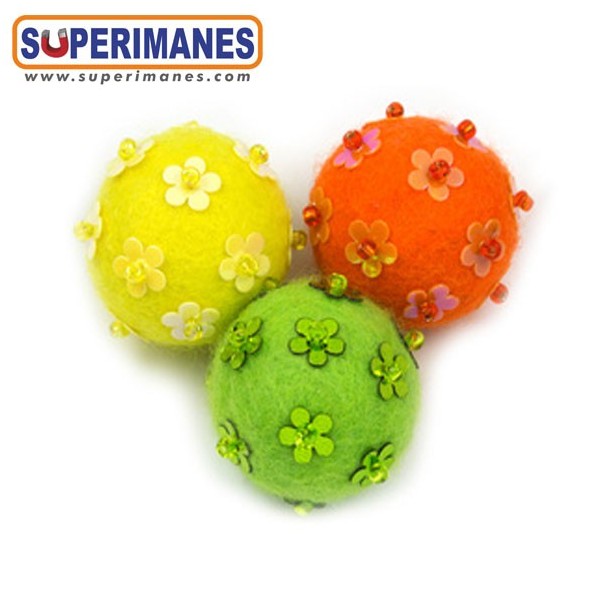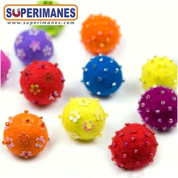 Realizadas las bolas de fieltro de colores con florecitas cosidas y perlas de vidrio. Y por supuesto: supermagnético.