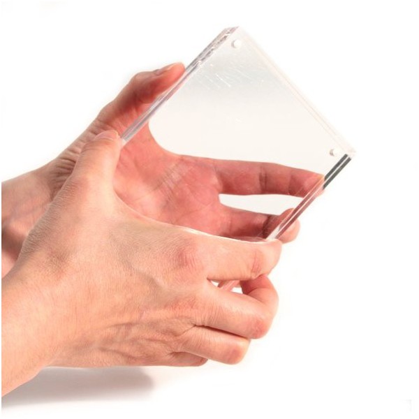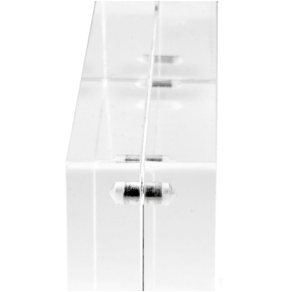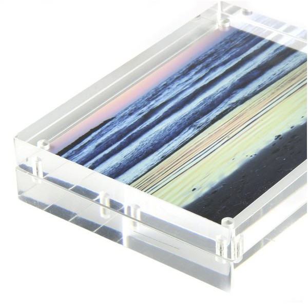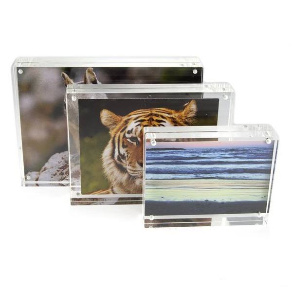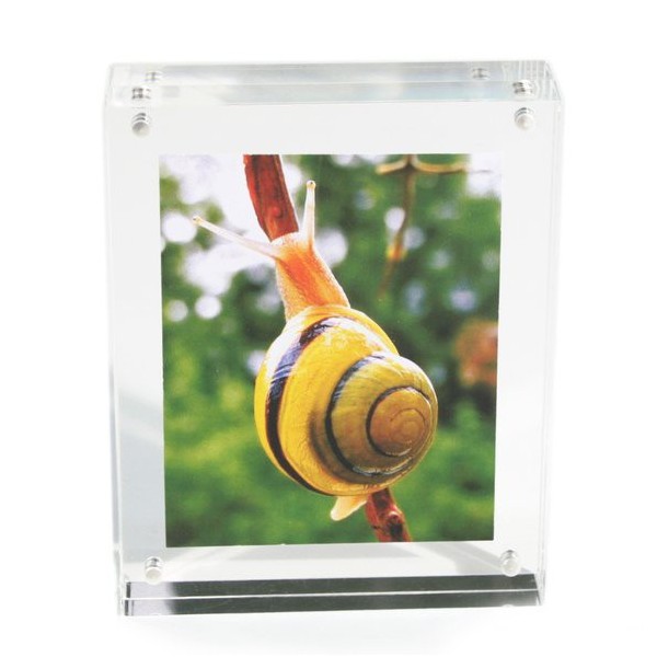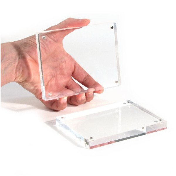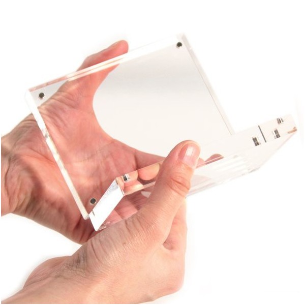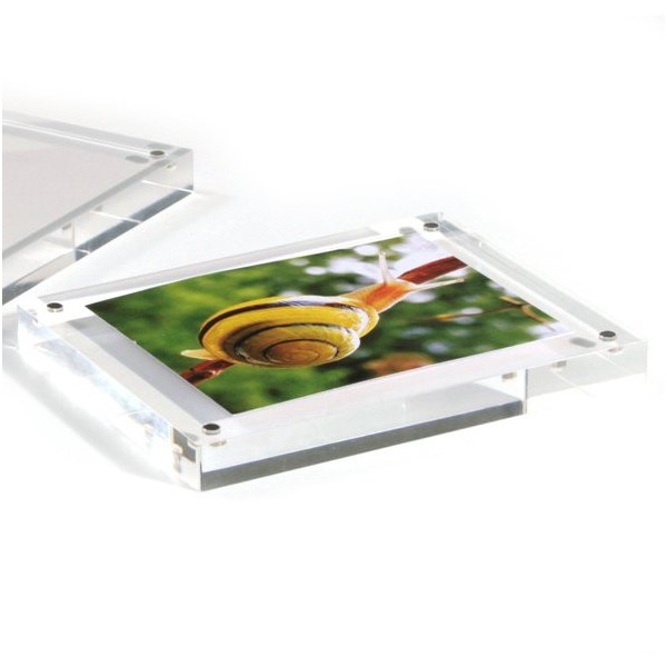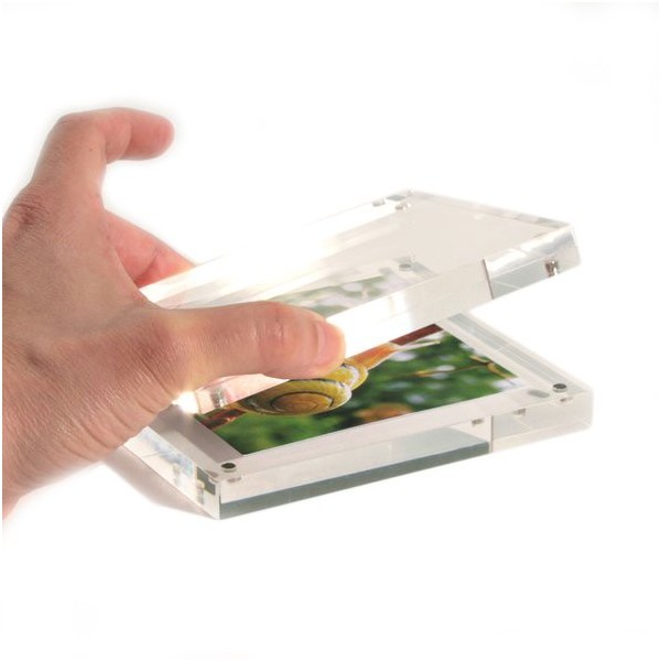Marco porta fotos o letrero con forma rectangular. En vidrio acrílico transparente. Marco a doble cara para mostrar sus fotos por ambos lados. Posibilidad de colocar en horizontal o vertical. Grosor 24mm. Apto para fotos medidas 11,5 x 9cm.