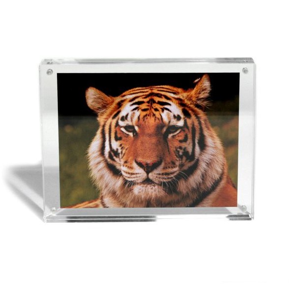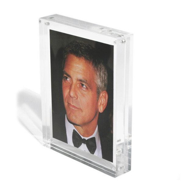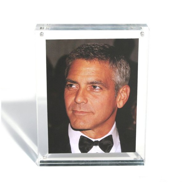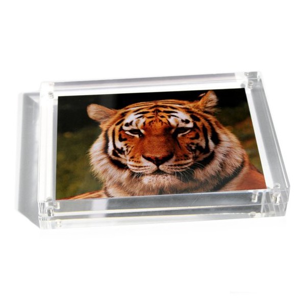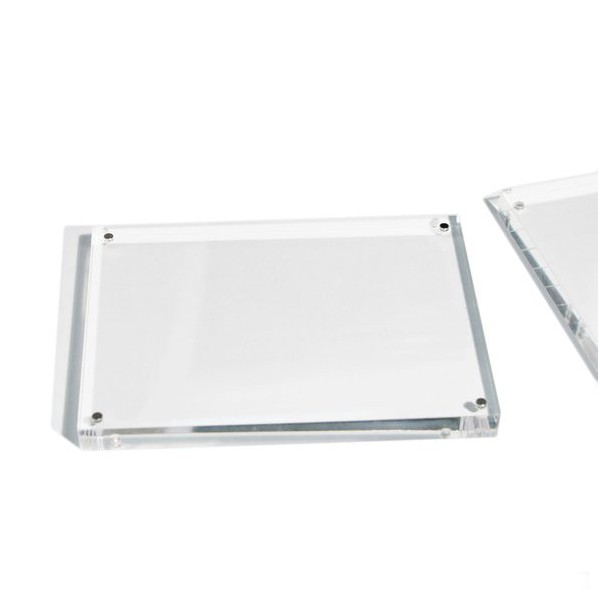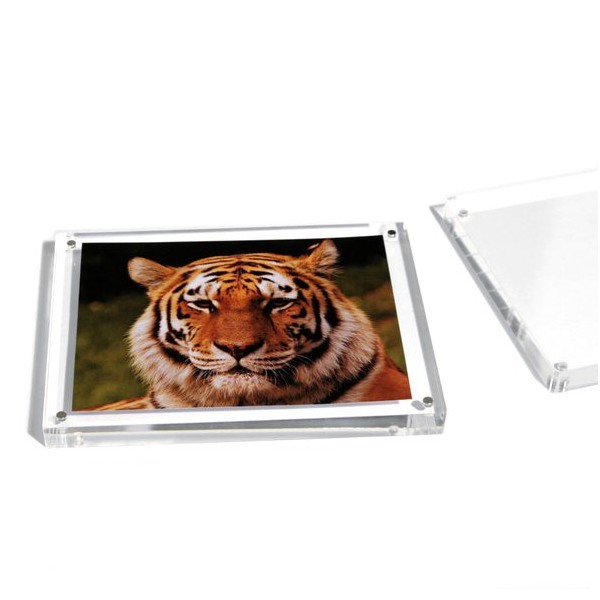 Marco porta fotos o letrero con forma rectangular. En vidrio acrílico transparente. Marco a doble cara para mostrar sus fotos por ambos lados. Posibilidad de colocar en horizontal o vertical. Grosor 24mm. Apto para fotos medidas 15 x 11,5cm.