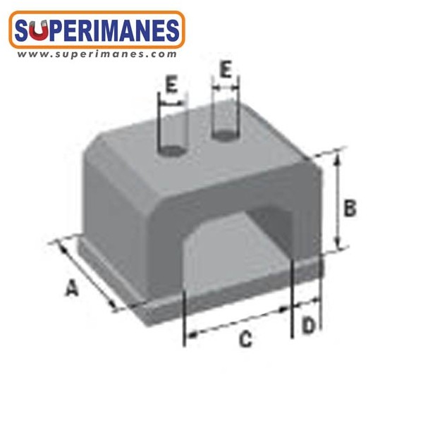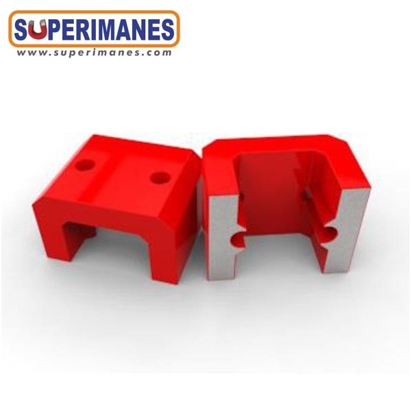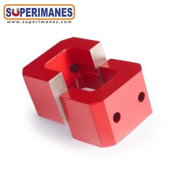 Base magnética en AlNiCo con forma de puente, tiene dos agujeros pasantes en la zona de arriba. Estos imanes tienen una medida de 57x41x41x14,5x8 mm. Imán redondo minúsculo. Magnetización axial. Con revestimiento en color rojo. Temperatura máxima de servicio de 350º C. La pieza tiene un peso de 792 gramos.