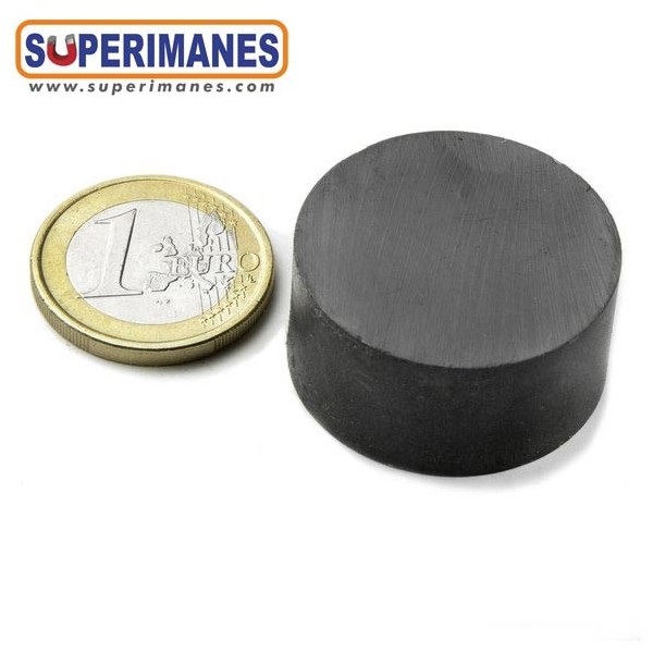 Este imán de ferrita redondo magnético tienen un diámetro de 30 mm y altura 15 mm. Tienen fuerza de sujeción de 3 kilogramos aproximadamente. Sin revestimiento. Temperatura máxima de servicio de 250º C. La pieza tiene un peso de 51 gramos.
