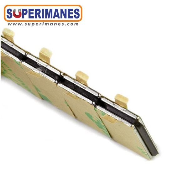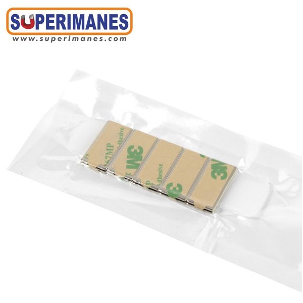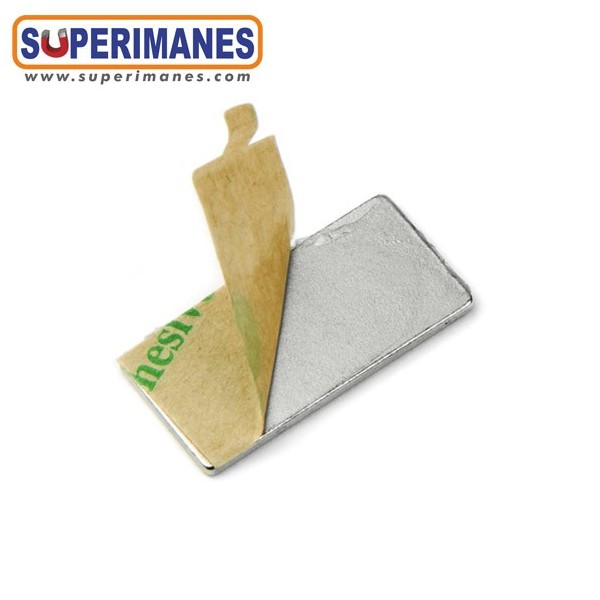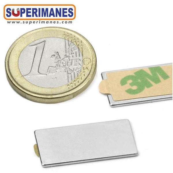 Imanes de neodimio autoadhesivos permanentes y fuertes. Bloque magnético en neodimio rectangular de longitud de 25 mm, ancho de 12 mm y altura de 1 mm. Tienen fuerza de sujeción de 1 kg. aprox. Imán magnetizado en N35 axial. Con revestimiento de níquel y adhesivo 3M en una cara. Temperatura máxima de servicio de 80º C. La pieza tiene un peso de 2,3 g.