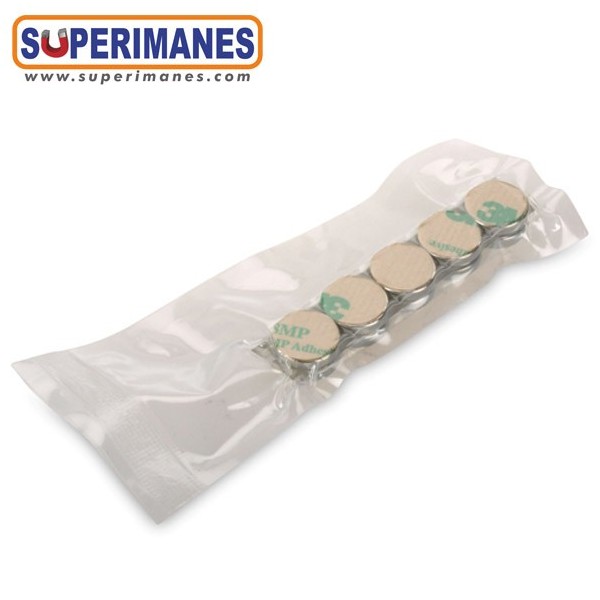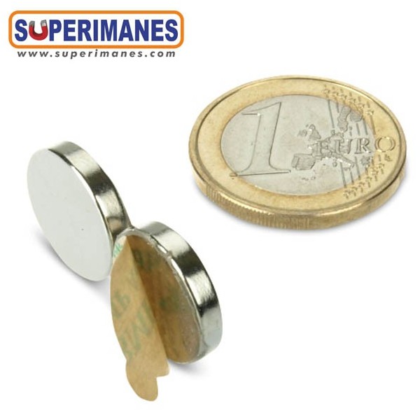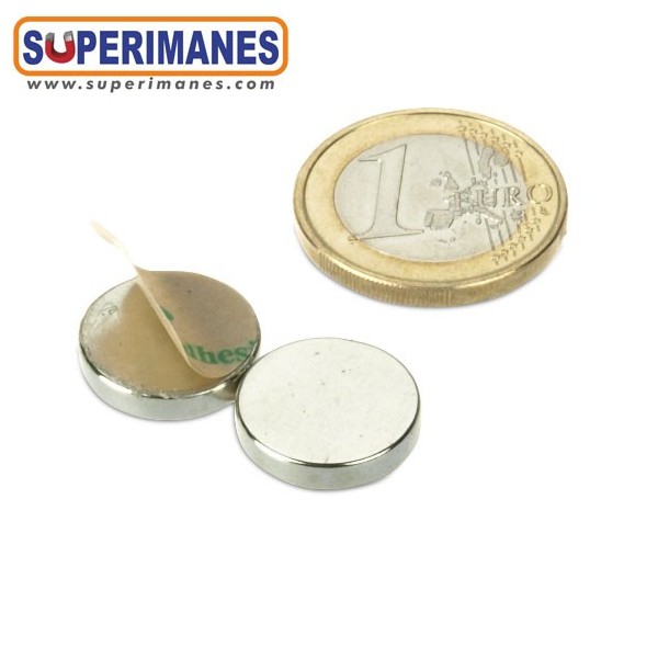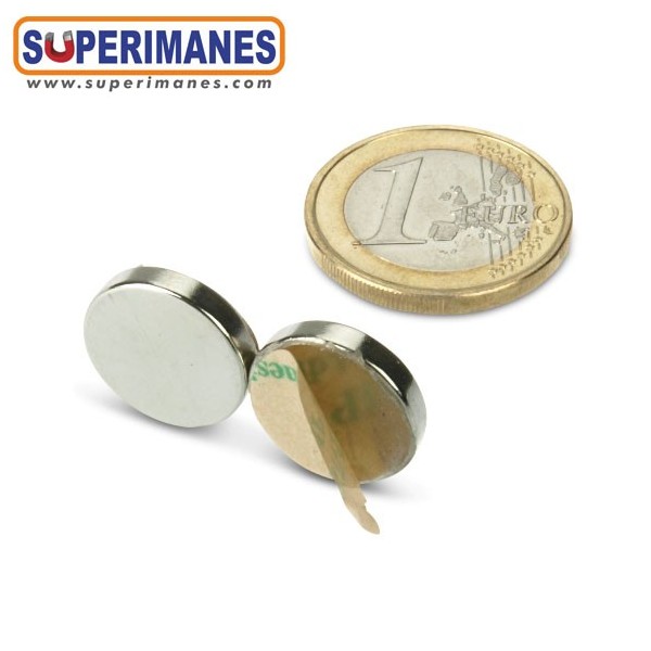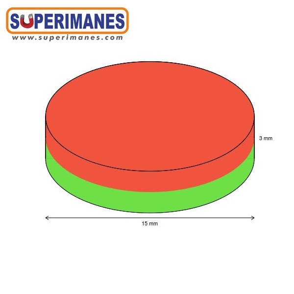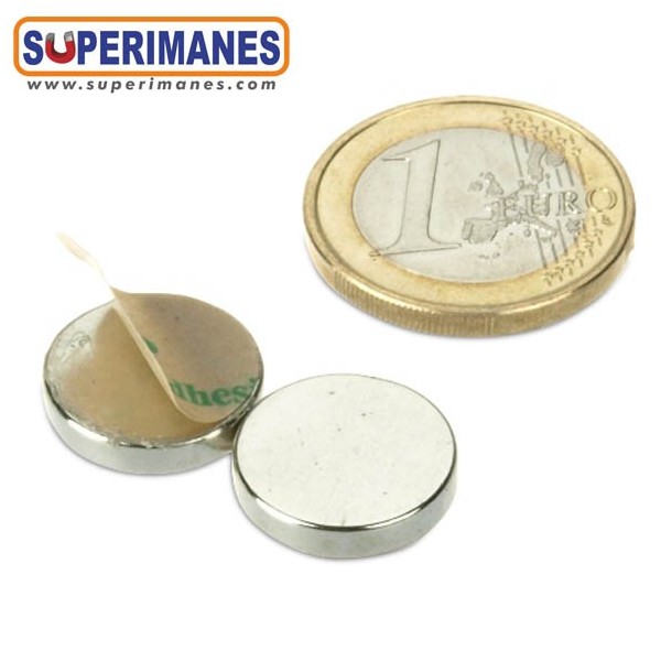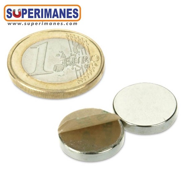Imanes adhesivos gruesos. Este imán de neodimio en forma de disco magnético redondo tiene un diámetro de 15 mm y altura 3 mm. Tienen fuerza de sujeción de 2,9 kilogramos aproximadamente. Imán redondo neodimio con autoadhesivo. Magnetizado en N35 axial. Con revestimiento de níquel. Temperatura máxima de servicio de 80º C. La pieza tiene un peso de 4 gramos.