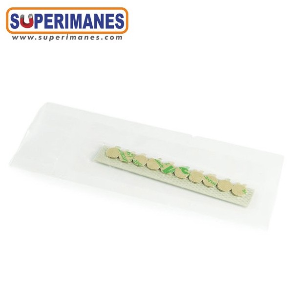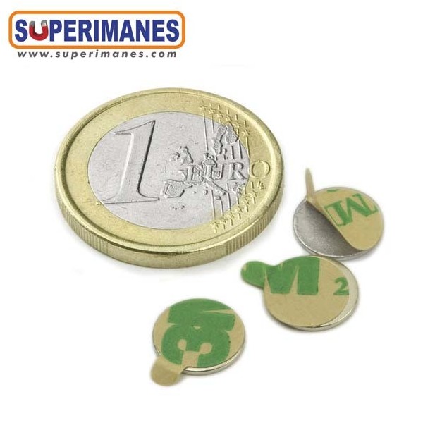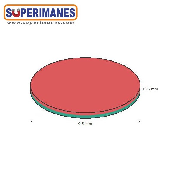 Imanes adhesivos super planos. Este pequeño imán de neodimio en forma de disco magnético redondo es de los más pequeños y estrechos que hay, tiene un diámetro de solo 9,5 mm y altura 0,75 mm. Tienen fuerza de sujeción de 380 gramos aproximadamente. Imán redondo extraplano. Magnetizado en N35 axial. Con revestimiento de níquel. Temperatura máxima de servicio de 80º C. La pieza tiene un peso de 0,4 gramos.