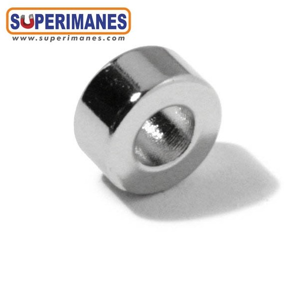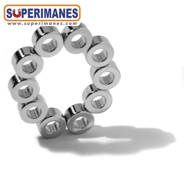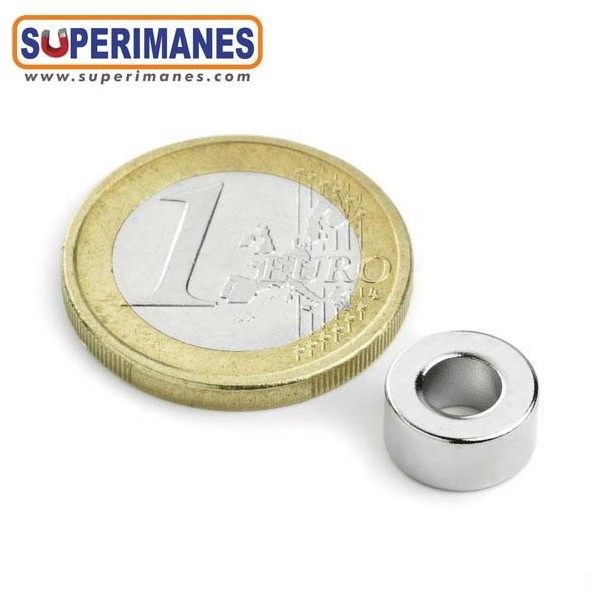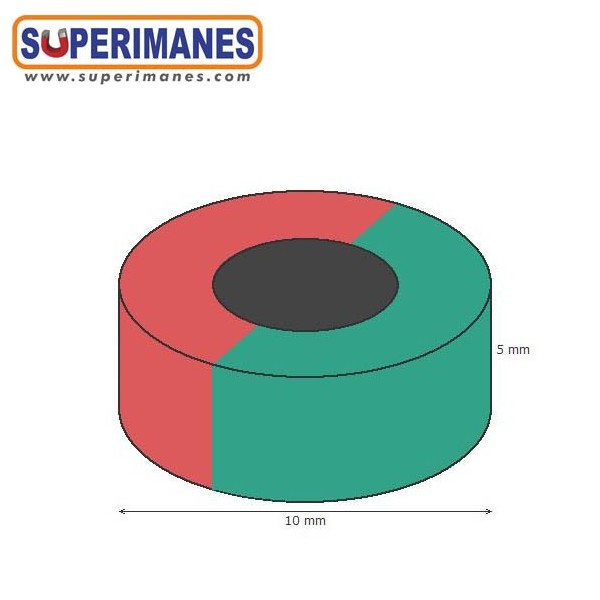Los aros magnéticos diametrales de neodimio son imanes permanentes y fuertes. Estos anillos magnéticos tienen un tamaño de diámetro exterior de 10 mm, interior de 5 mm y altura de 5 mm. Tienen fuerza de sujeción de 700 g. aproximadamente. Imán de neodimio con forma de aro muy potente. Magnetizado en N45 diametral (paralelo al diámetro). Con revestimiento en níquel. Temperatura máxima de servicio de 80º C. La pieza tiene un peso de 2,24 g.