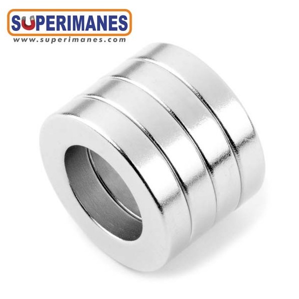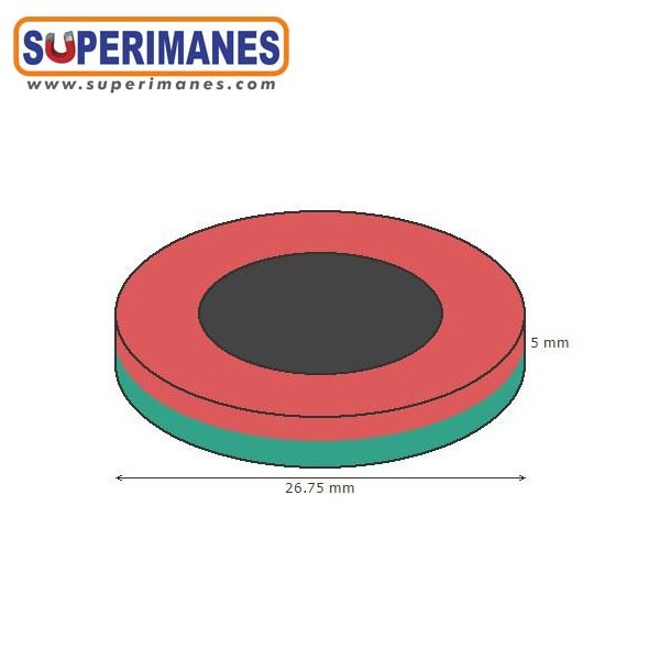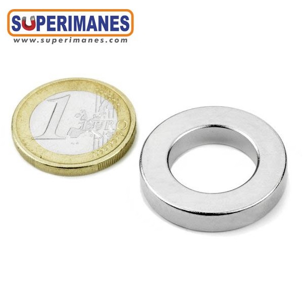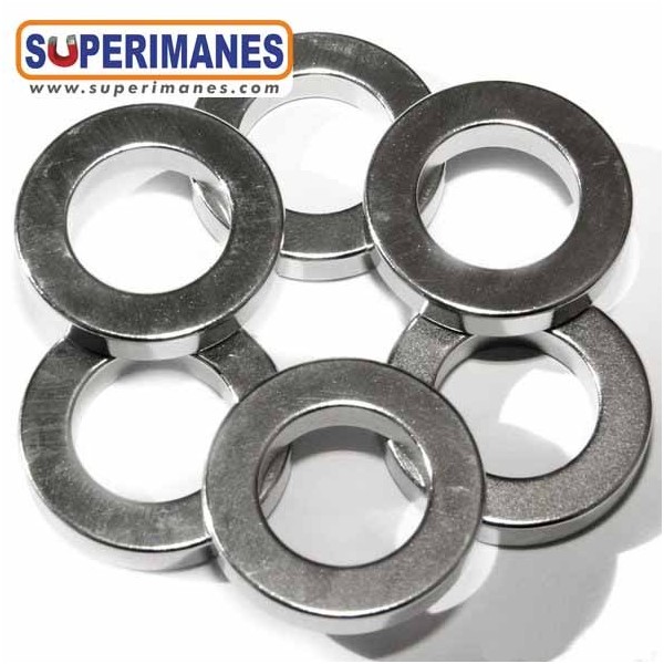 Los aros magnéticos de neodimio son imanes permanentes y fuertes. Estos anillos magnéticos tienen un tamaño de diámetro exterior de 26,75 mm, interior de 16 mm y altura de 5 mm. Tienen fuerza de sujeción de 8,3 kg. aproximadamente. Imán de neodimio con forma de aro muy potente. Magnetizado en N42 axial. Con revestimiento en níquel. Temperatura máxima de servicio de 80º C. La pieza tiene un peso de 14 g.