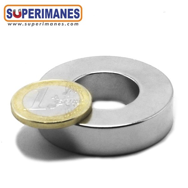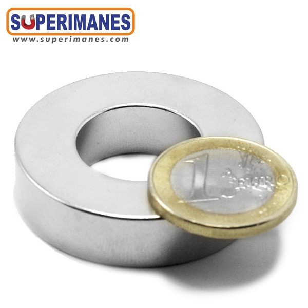 Los aros magnéticos de neodimio son imanes permanentes y fuertes. Estos anillos magnéticos tienen un tamaño de diámetro exterior de 40 mm, interior de 20 mm y altura de 10 mm. Tienen fuerza de sujeción de 25 kg. aproximadamente. Imán de neodimio con forma de aro muy potente. Magnetizado en N38 axial. Con revestimiento en níquel. Temperatura máxima de servicio de 80º C. La pieza tiene un peso de 71 g.