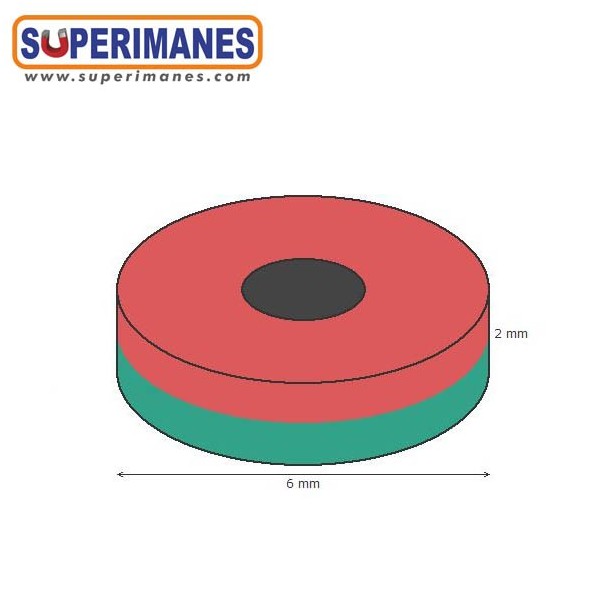 Los aros magnéticos de neodimio son imanes permanentes y fuertes. Estos anillos magnéticos tienen un tamaño pequeño con diámetro exterior de 6 mm, interior de 2 mm y altura de 2 mm. Tienen fuerza de sujeción de 760 gramos aproximadamente. Imán de neodimio con forma de aro muy potente. Magnetizado en N45 axial. Con revestimiento dorado. Temperatura máxima de servicio de 80º C. La pieza tiene un peso de 0,38 g.