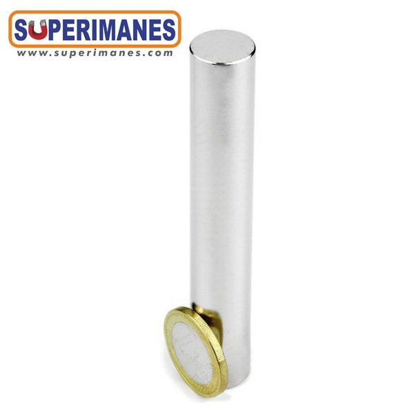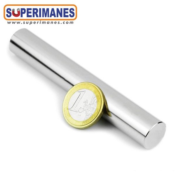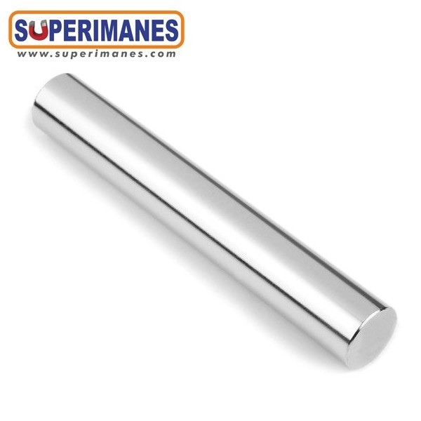 Los cilindros magnéticos de neodimio son imanes permanentes y fuertes. Estas barras magnéticas tienen un tamaño alargado con diámetro de 15 mm y altura de 100 mm. Tienen fuerza de sujeción de 8,2 kg. aproximadamente. Imán cilíndrico muy potente en neodimio (NdFeB). Magnetizado en N35 axial. Con revestimiento de níquel (Ni-Cu-Ni). Temperatura máxima de servicio de 80º C. La pieza tiene un peso de 130 g.