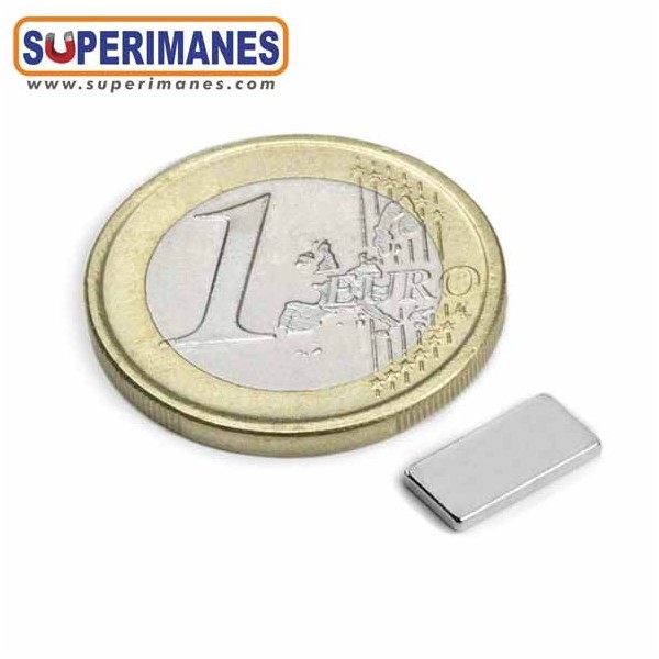 Este imán permanente de neodimio rectangular magnético tiene un largo de 10 mm y ancho de 5 mm y altura 1 mm. Tienen fuerza de sujeción de 650 gramos aproximadamente. Imán bloque pequeño. Magnetizado en N50 axial. Con revestimiento de níquel. Temperatura máxima de servicio de 80º C. La pieza tiene un peso de 0,38 gramos.