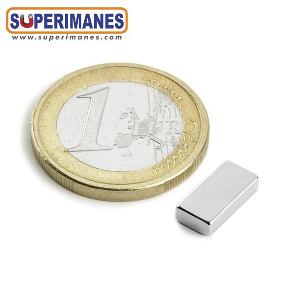 Este imán permanente de neodimio rectangular magnético tiene un largo de 10 mm y ancho de 5 mm y altura 2 mm. Tienen fuerza de sujeción de 1,2 kilogramos aproximadamente. Imán bloque pequeño. Magnetizado en N50 axial. Con revestimiento de níquel. Temperatura máxima de servicio de 80º C. La pieza tiene un peso de 0,76 gramos.