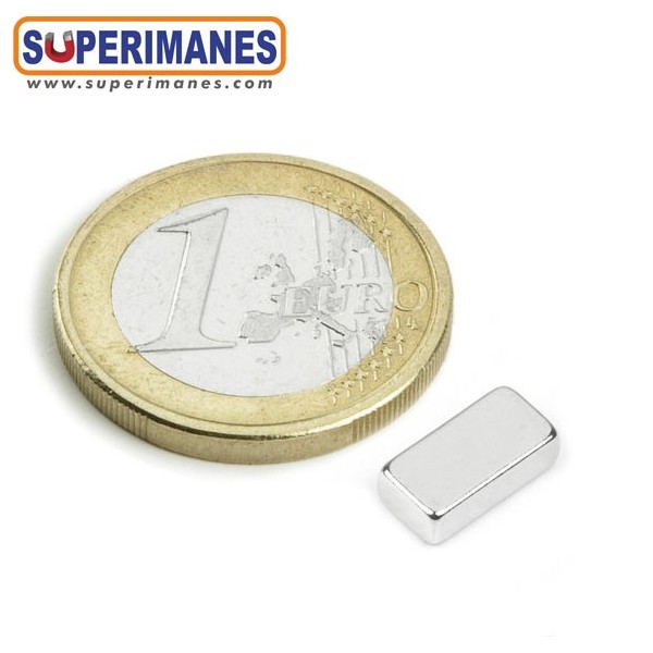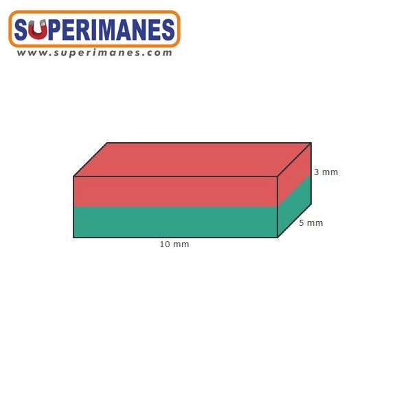 Este imán permanente de neodimio rectangular magnético tiene un largo de 10 mm y ancho de 5 mm y altura 3 mm. Tienen fuerza de sujeción de 1,5 kilogramos aproximadamente. Imán bloque pequeño. Magnetizado en N45 axial. Con revestimiento de níquel. Temperatura máxima de servicio de 80º C. La pieza tiene un peso de 1,1 gramos.