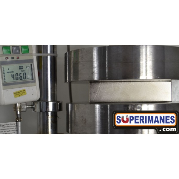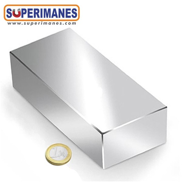 Imanes permanentes grandes XXL y fuertes. Fabricados en neodimio en forma de bloque magnético rectangular, tienen una longitud de 120 mm, ancho de 60 mm y altura de 30 mm. Tienen fuerza de sujeción de 400 kilogramos aproximadamente. Imán cuadrado muy potente. Magnetizado en N45 axial. Con revestimiento de níquel. Temperatura máxima de servicio de 80º C. La pieza tiene un peso de 800 g.