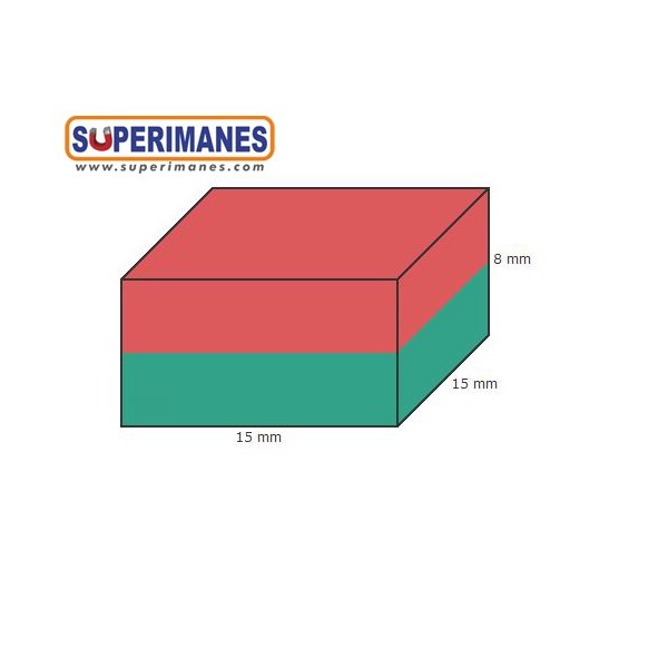 Este imán permanente de neodimio cuadrados magnético tiene un largo de 15 mm y ancho de 15 mm y altura 8 mm. Tienen fuerza de sujeción de 7,6 kilogramos aproximadamente. Imán bloque mediano. Magnetizado en N42 axial. Con revestimiento de níquel. Temperatura máxima de servicio de 80º C. La pieza tiene un peso de 14 gramos.