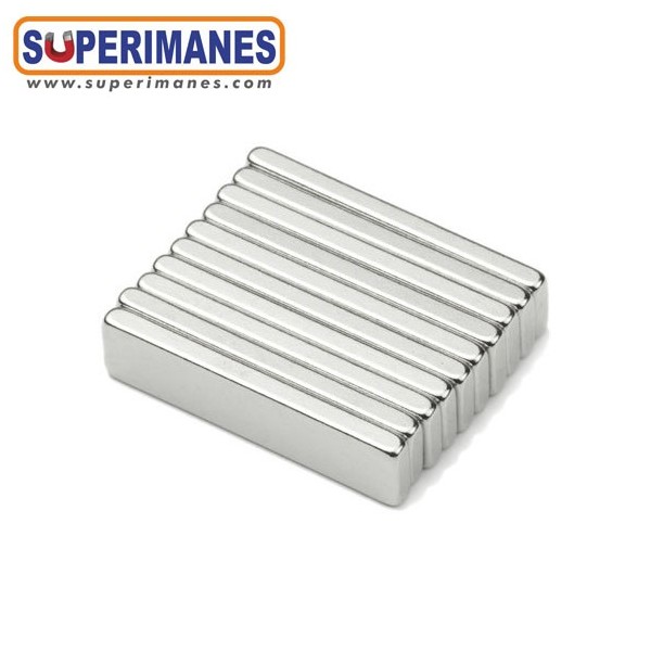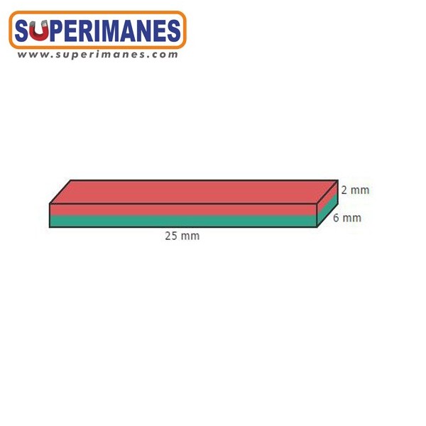 Este pequeño imán de neodimio rectangular magnético tiene un largo de 25 mm y ancho de 6 mm y altura 2 mm. Tienen fuerza de sujeción de 1,7 kilogramos aproximadamente. Imán bloque pequeño. Magnetizado en 45SH axial. Con revestimiento de níquel. Temperatura máxima de servicio de 150º C. La pieza tiene un peso de 2,3 gramos.