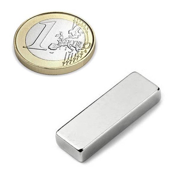 Este imán permanente de neodimio rectangular magnético tiene un largo de 30 mm y ancho de 10 mm y altura 5 mm. Tienen fuerza de sujeción de 6 kilogramos aproximadamente. Imán bloque mediano. Magnetizado en N42 axial. Con revestimiento de níquel. Temperatura máxima de servicio de 80º C. La pieza tiene un peso de 11 gramos.
