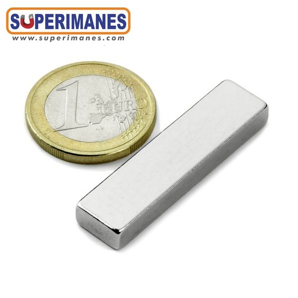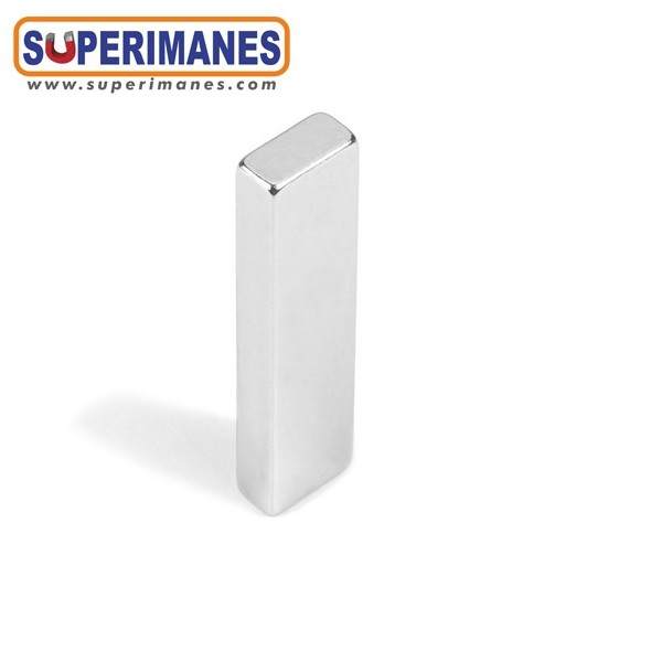 Este imán permanente de neodimio rectangular magnético tiene un largo de 40 mm y ancho de 10 mm y altura 5 mm. Tienen fuerza de sujeción de 9,5 kilogramos aproximadamente. Imán bloque mediano. Magnetizado en N42 axial. Con revestimiento de níquel. Temperatura máxima de servicio de 80º C. La pieza tiene un peso de 15 gramos.