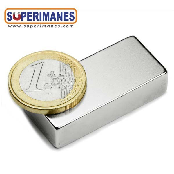 Este imán permanente de neodimio rectangular magnético tiene un largo de 40 mm y ancho de 18 mm y altura 10 mm. Tienen fuerza de sujeción de 20 kilogramos aproximadamente. Imán bloque pequeño. Magnetizado en N35 axial. Con revestimiento de níquel. Temperatura máxima de servicio de 80º C. La pieza tiene un peso de 54 gramos.