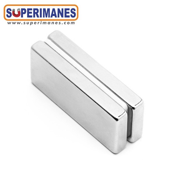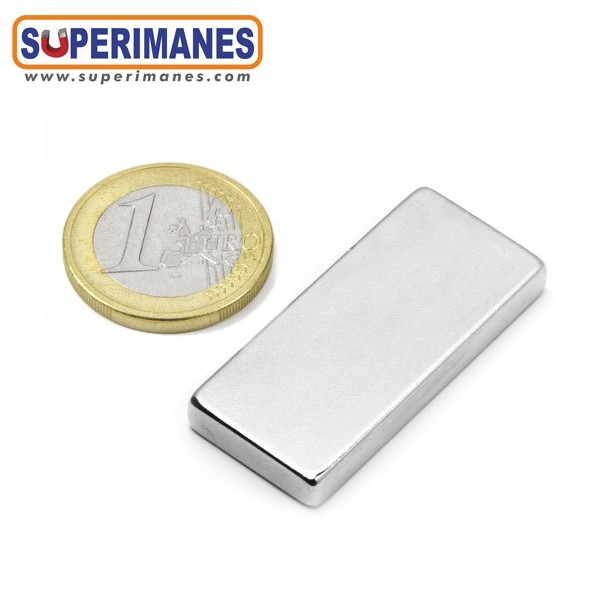 Este imán permanente de neodimio rectangular magnético tiene un largo de 40 mm y ancho de 18 mm y altura 5 mm. Tienen fuerza de sujeción de 8 kilogramos aproximadamente. Imán bloque pequeño. Magnetizado en N35 axial. Con revestimiento zincado. Temperatura máxima de servicio de 80º C. La pieza tiene un peso de 27 gramos.