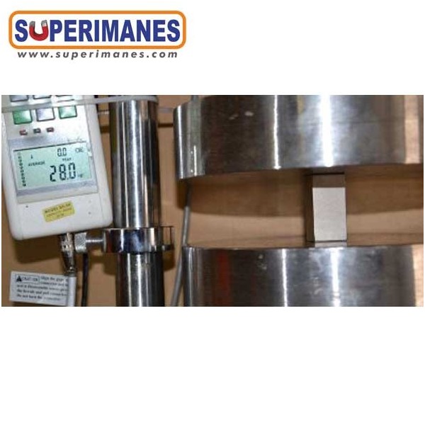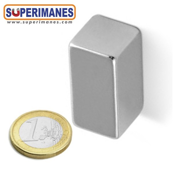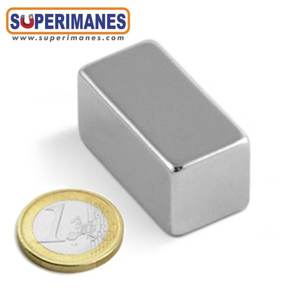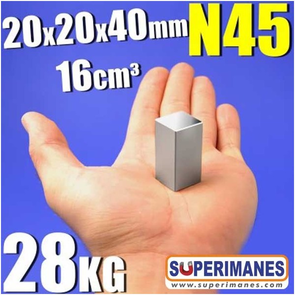 Este imán permanente de neodimio rectangular magnético tiene un largo de 40 mm y ancho de 20 mm y altura 20 mm. Tienen fuerza de sujeción de 28 kilogramos aproximadamente. Imán bloque mediano. Magnetizado en N45 con magnetización longitudinal. Con revestimiento de níquel. Temperatura máxima de servicio de 80º C. La pieza tiene un peso de 120 gramos.
