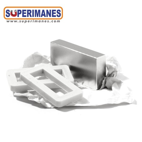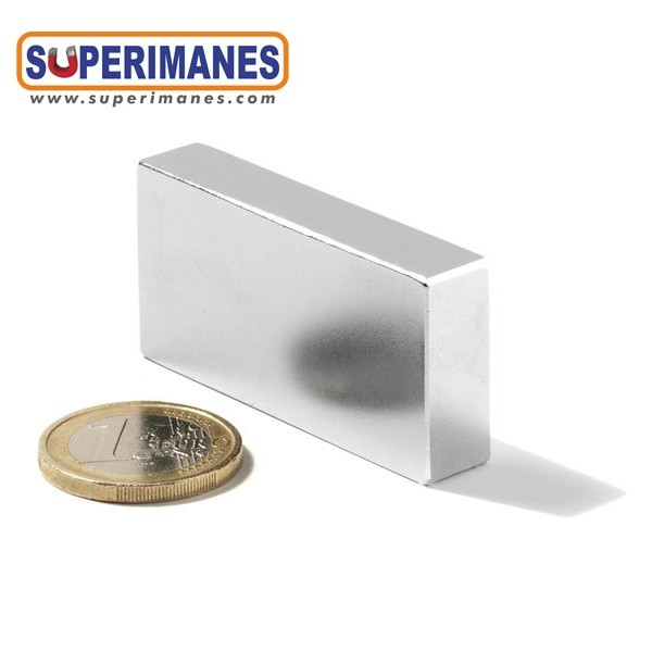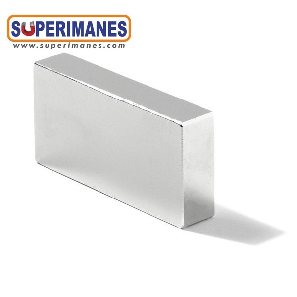 Este imán permanente de neodimio rectangular magnético tiene un largo de 46 mm y ancho de 30 mm y altura 10 mm. Tienen fuerza de sujeción de 30 kilogramos aproximadamente. Imán bloque pequeño. Magnetizado en N40 axial. Con revestimiento de níquel. Temperatura máxima de servicio de 80º C. La pieza tiene un peso de 104 gramos.
