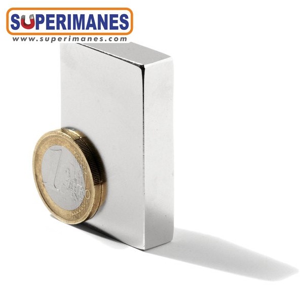 Este imán permanente de neodimio rectangular magnético tiene un largo de 50 mm y ancho de 25 mm y altura 10 mm. Tienen fuerza de sujeción de 12 kilogramos aproximadamente. Imán bloque mediano. Magnetizado en N40 con magnetización longitudinal. Con revestimiento de níquel. Temperatura máxima de servicio de 80º C. La pieza tiene un peso de 95 gramos.