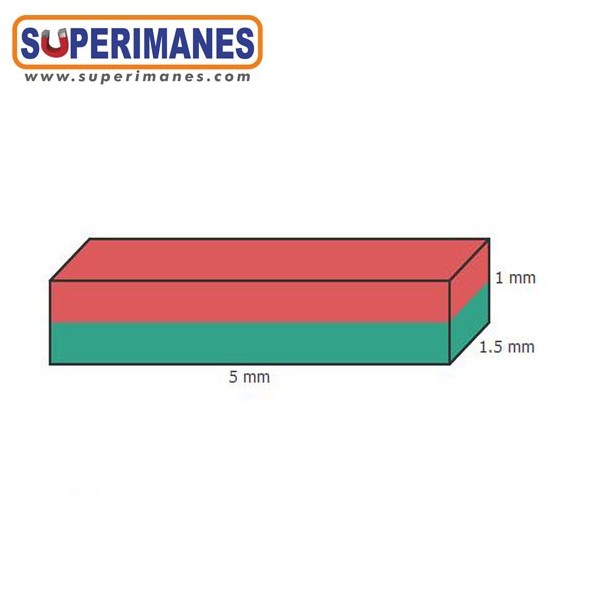 Este minúsculo imán de neodimio rectangular magnético tiene un largo de 5 mm y ancho de 1.5 mm y altura 1 mm. Tienen fuerza de sujeción de 140 gramos aproximadamente. Imán bloque pequeño. Magnetizado en N45 axial. Con revestimiento de níquel. Temperatura máxima de servicio de 80º C. La pieza tiene un peso de 0,057 gramos.