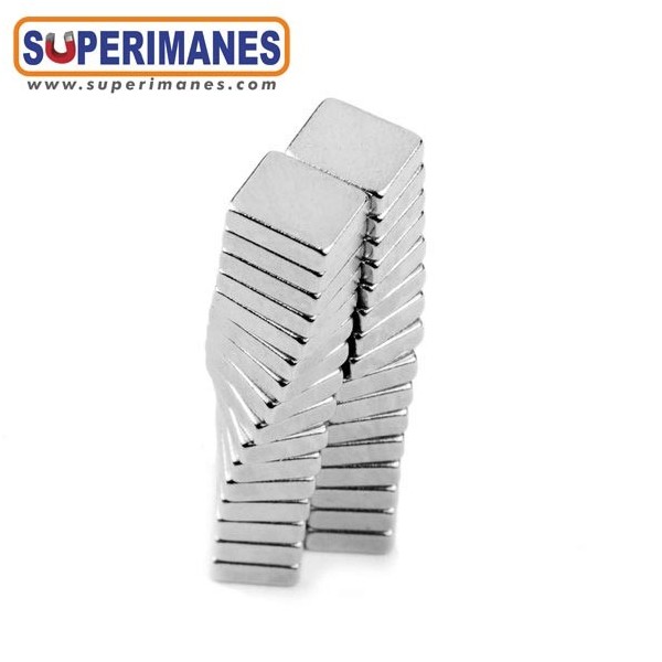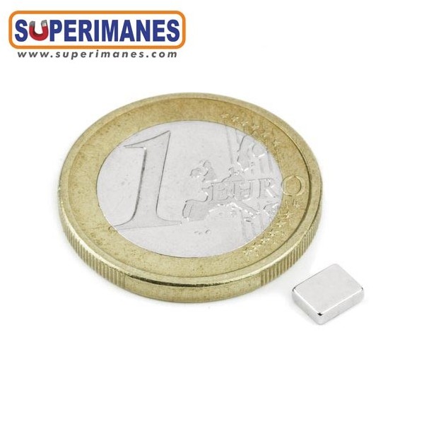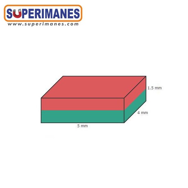 Este minúsculo imán de neodimio rectangular magnético tiene un largo de 5 mm y ancho de 4 mm y altura 1.5 mm. Tienen fuerza de sujeción de 500 gramos aproximadamente. Imán bloque pequeño. Magnetizado en N48 axial. Con revestimiento de níquel. Temperatura máxima de servicio de 80º C. La pieza tiene un peso de 0,23 gramos.