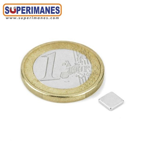 Este minúsculo imán de neodimio cuadrado magnético tiene un largo de 5 mm y ancho de 5 mm y altura de 1 mm. Tienen fuerza de sujeción de 350 gramos aproximadamente. Imán bloque pequeño. Magnetizado en 44H axial. Con revestimiento de níquel. Temperatura máxima de servicio de 120º C. La pieza tiene un peso de 0,19 gramos.