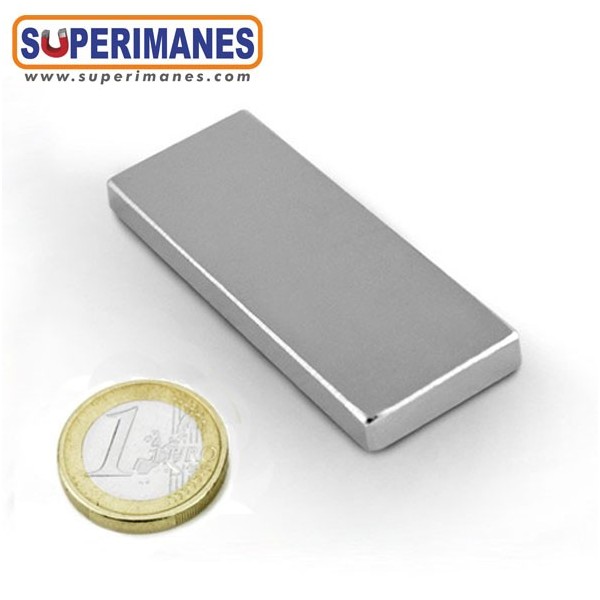 Este imán permanente de neodimio rectangular magnético tiene un largo de 60 mm y ancho de 20 mm y altura 5 mm. Tienen fuerza de sujeción de 40 kilogramos aproximadamente. Imán bloque mediano. Magnetizado en N45 axial. Con revestimiento de níquel. Temperatura máxima de servicio de 80º C. La pieza tiene un peso de 45 gramos.