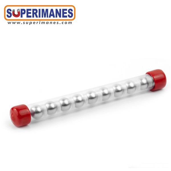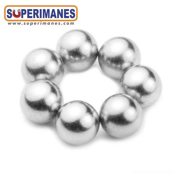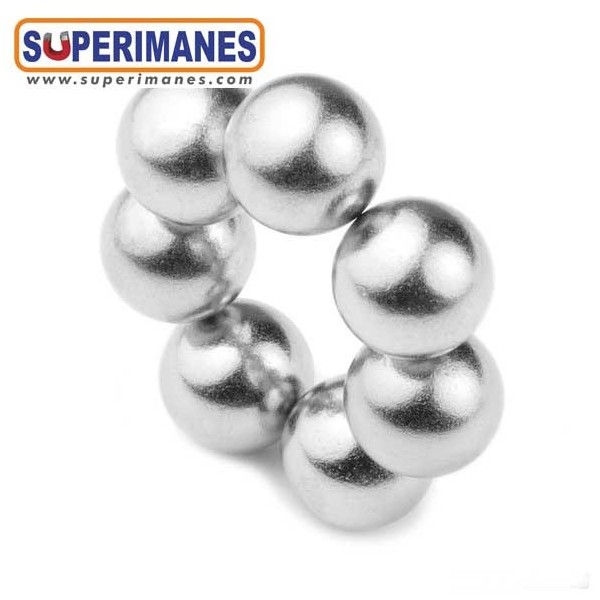 Esferas, bolas o canicas magnéticas de diámetro 10 mm. Estas esferas tienen un recubrimiento en cromo color plata (NiCuNiCr) y una fuerza de sujeción de 1,4 kilogramos aproximadamente, magnetizado en N40 axial. Temperatura máxima de servicio 80º C. La pieza tiene un peso de 4 gramos aproximados.