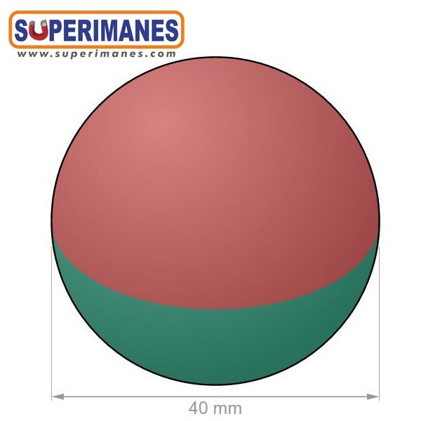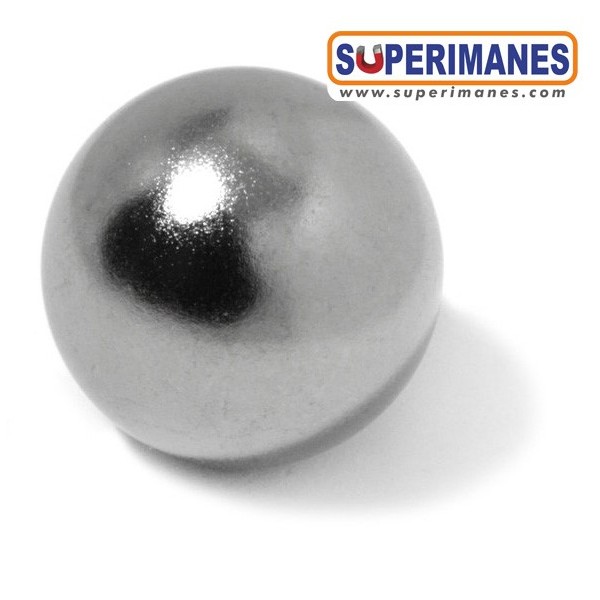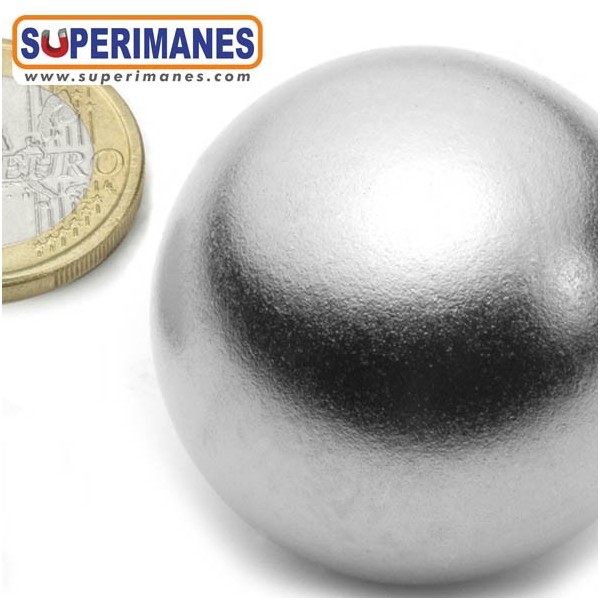 Esferas, bolas o canicas magnéticas de diámetro 40 mm. Estas esferas tienen un recubrimiento en cromo color plata (NiCuNiCr) y una fuerza de sujeción de 23 kilogramos aproximadamente, magnetizado en N40 axial. Temperatura máxima de servicio 80º C. La pieza tiene un peso de 250 gramos aproximados.