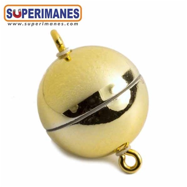 Cierre magnético para bisutería 15mm diámetro, color dorado brillante. Este broche magnético es de plástico con un acabado en color dorado brillo, se abre por la mitad donde lleva insertados un imán a cada lado que hace que se atraigan cada mitad para su cierre.
