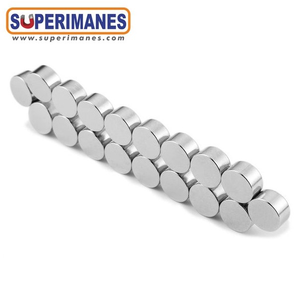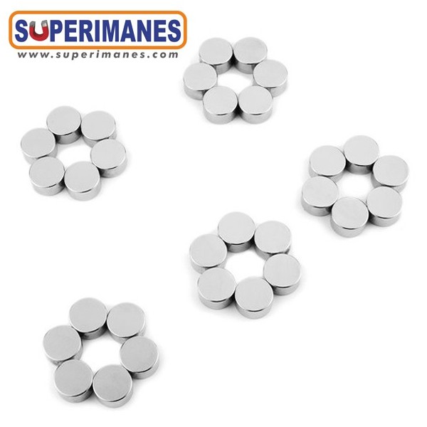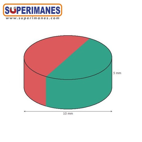 Imanes pequeños diametrales, super potentes, de neodimio, en forma de disco magnético redondo, tienen un diámetro de 10 mm y altura 5 mm. Tienen fuerza de sujeción de 1 kilogramos aproximadamente. Imán redondo muy potente. Magnetizado en N45 diametral. Con revestimiento de níquel. Temperatura máxima de servicio de 80º C. La pieza tiene un peso de 3 gramos.