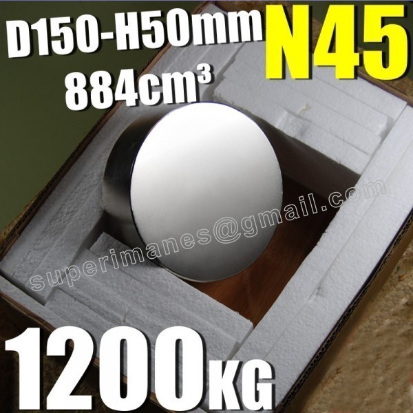 Superiman permanentes grandes XXL y fuertes de neodimio en forma de disco magnético redondo, tienen un diámetro de 150 mm y altura de 50 mm. Tienen fuerza de sujeción de 1.200 kilogramos aproximadamente. Imán redondo muy muy potente. Magnetizado en N45 axial. Con revestimiento de níquel. Temperatura máxima de servicio de 80º C. La pieza tiene un peso de 6,65 kg.