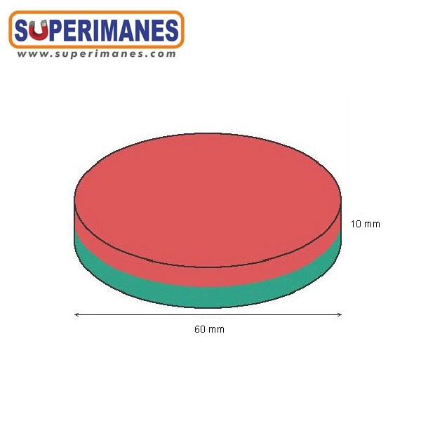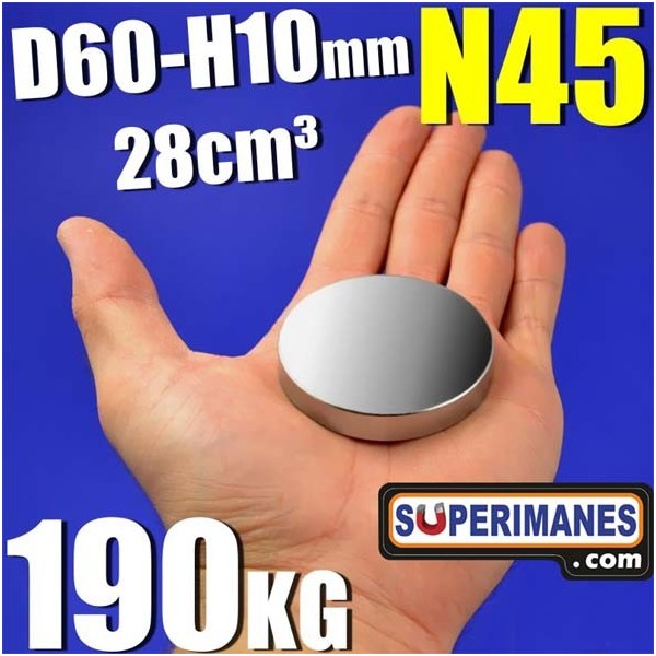 Imanes permanentes y fuertes de neodimio en forma de disco magnético redondo, tienen un diámetro de 60 mm y altura de 10 mm. Tienen fuerza de sujeción de 190 kilogramos aproximadamente. Imán redondo muy potente. Magnetizado en N45 axial. Con revestimiento de níquel. Temperatura máxima de servicio de 80º C. La pieza tiene un peso de 210 gramos.