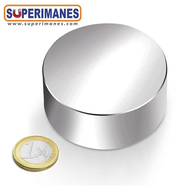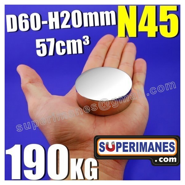 Imanes permanentes grandes XXL y fuertes de neodimio en forma de disco magnético redondo, tienen un diámetro de 60 mm y altura de 20 mm. Tienen fuerza de sujeción de 190 kilogramos aproximadamente. Imán redondo muy potente. Magnetizado en N45 axial. Con revestimiento de níquel. Temperatura máxima de servicio de 80º C. La pieza tiene un peso de 430 gramos.