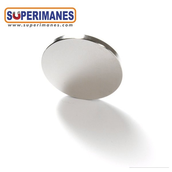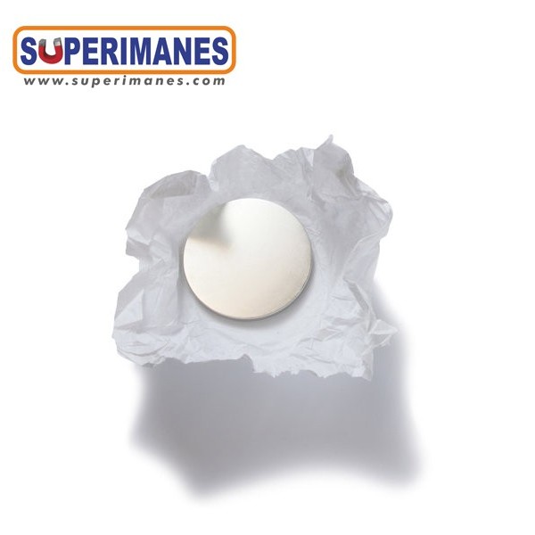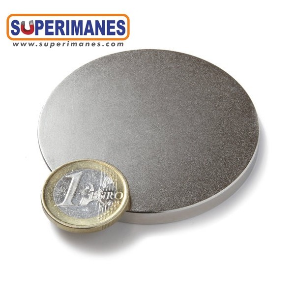 Imanes permantentes y fuertes de neodimio en forma de disco magnético redondo, tienen un diámetro de 60 mm y altura de 5 mm. Tienen fuerza de sujeción de 21 kilogramos aproximadamente. Imán redondo muy potente. Magnetizado en N42 axial. Con revestimiento de níquel. Temperatura máxima de servicio de 80º C. La pieza tiene un peso de 107 gramos.