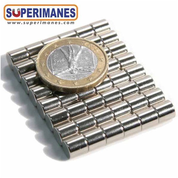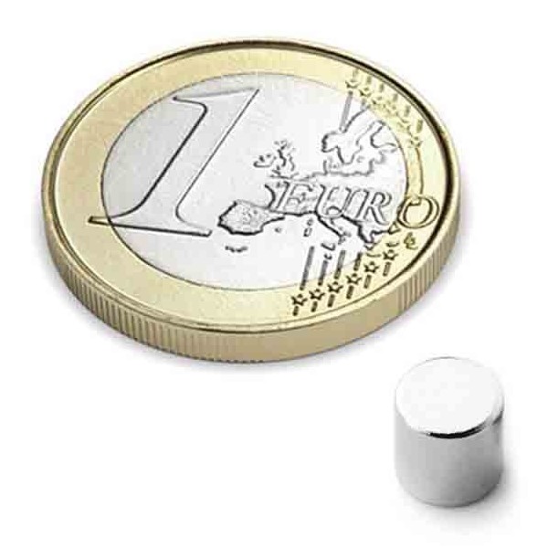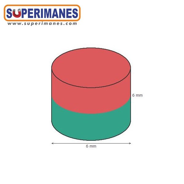 Este pequeño imán de neodimio es bastante grueso. Disco magnético redondo con diámetro de 6 mm y altura 6 mm. Tienen fuerza de sujeción de 1,5 kilogramos aproximadamente. Magnetizado en N48 axial. Con revestimiento de níquel. Temperatura máxima de servicio de 80º C. La pieza tiene un peso de 1,3 gramos.