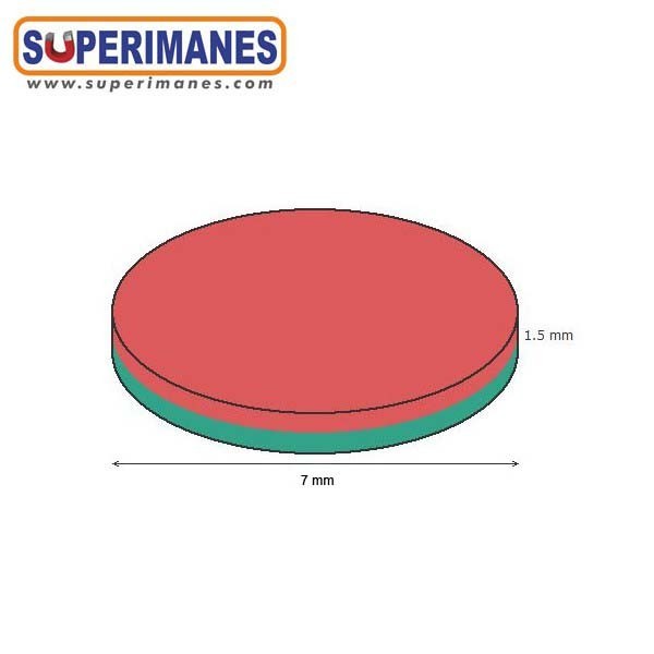 Este pequeño imán de neodimio en forma de disco redondo tiene un diámetro de 7 mm y altura 1.5 mm. Disco magnético con fuerza de sujeción de 570 gramos aproximadamente. Imán redondo minúsculo. Magnetizado en N35 axial. Con revestimiento de níquel. Temperatura máxima de servicio de 80º C. La pieza tiene un peso de 0,43 gramos.