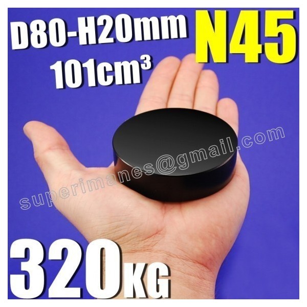 Imanes permanentes grandes XXL y fuertes de neodimio en forma de disco magnético redondo, tienen un diámetro de 80 mm y altura de 20 mm y son en color negro. Tienen fuerza de sujeción de 320 kilogramos aproximadamente. Imán redondo muy potente. Magnetizado en N45 axial. Con revestimiento en epoxy. Temperatura máxima de servicio de 80º C. La pieza tiene un peso de 760 gramos.