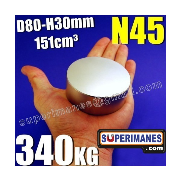 Imanes permanentes grandes XXL y fuertes de neodimio en forma de disco magnético redondo, tienen un diámetro de 80 mm y altura de 30 mm. Tienen fuerza de sujeción de 340 kilogramos aproximadamente. Imán redondo muy potente. Magnetizado en N45 axial. Con revestimiento de níquel. Temperatura máxima de servicio de 80º C. La pieza tiene un peso de 1,14 kilogramos.