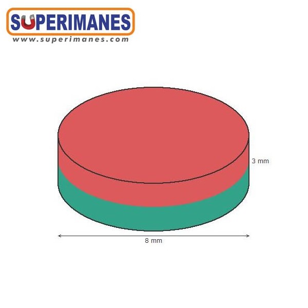 Este pequeño imán de neodimio en forma de disco redondo tiene un diámetro de 8 mm y altura 3 mm. Disco magnético con fuerza de sujeción de 1,5 kilogramos aproximadamente. Magnetizado en N45 axial. Con revestimiento de níquel. Temperatura máxima de servicio de 80º C. La pieza tiene un peso de 1,1 gramos.