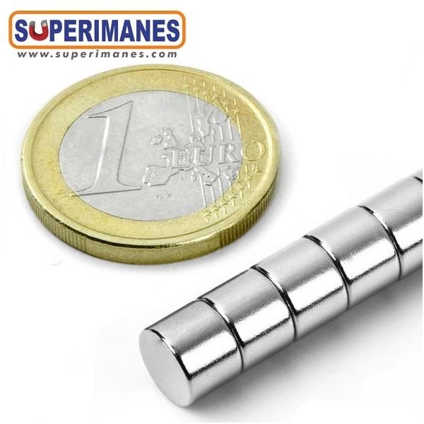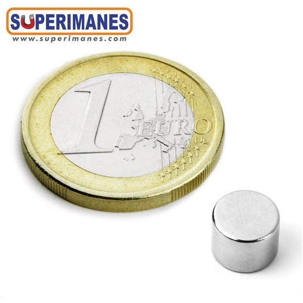Este pequeño imán de neodimio es super potente, magnetizado en N45 axial, en forma de disco redondo tiene un diámetro de 8 mm y altura 6 mm. Disco magnético con fuerza de sujeción de 2,4 kilogramos aproximadamente. Con revestimiento de níquel. Temperatura máxima de servicio de 80º C. La pieza tiene un peso de 2,3 gramos.